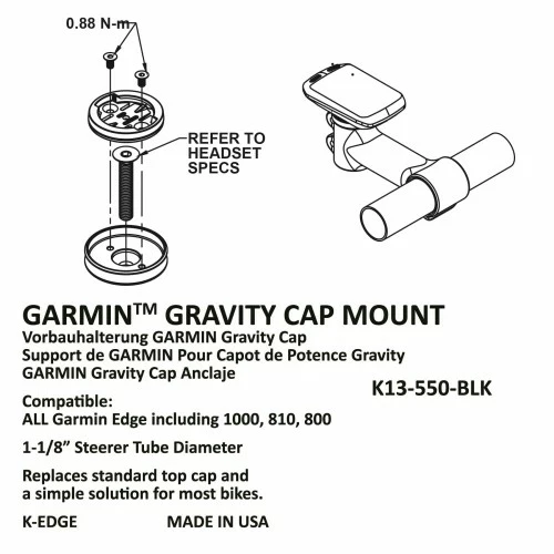 Gravity Cap er ideel til Downhill og Enduro mountainbikes, men også en fantastisk løsning til enhver mountainbikecykel.Specifikationer:CNC bearbejdet 6061-T6 aluminiumsplatform, sprøjtestøbt Garmin specifik co-polymer interfaceKompatibilitet: Alle Garmin Edge®-computere inklusive 1030*, 1000*, 830, 820, 810*, 800*, 510, 530, 520, 500, 200, 130, 25, 20. Understøtter også Touring, Touring 310XT og 910XT. (Større EDGE-computere såsom 800, 810, 1000, 1030 kan forstyrre meget stejle, opretstående stilkvinkler.)Fremstillet i Boise, Idaho, USA.Livstidsgaranti mod materiale- eller fabrikationsfejl. Model Varemærke K-Edge