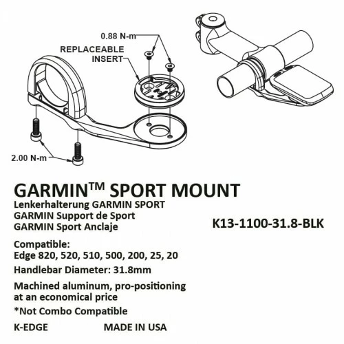 K-EDGEs legendariske CNC-bearbejdede aluminiumskvalitet og styrke til den prisbevidste cyklist. Professionel placering af din computer, ud foran og flugter med toppen af styret.Specifikationer: Lavet i USA. LivstidsgarantiCNC bearbejdet 6061-T6 aluminiumsmonteringPasser til 31,8 mm styrKompatibel – Garmin 830, 820, 530, 520, 510, 500, 25, 20.Vægt – 48 gramAnodiseret farve – sort. Laserætset K-EDGE logoSkjult to-bolt monteringsdesignIkke combo (kamera/lys nedenunder) kompatibelUdskiftelig Garmin eller Wahoo co-polymer plastindsats er designet til at gå i stykker ved et styrt for at beskytte tappene på bagsiden af computerens krop Model Varemærke K-Edge